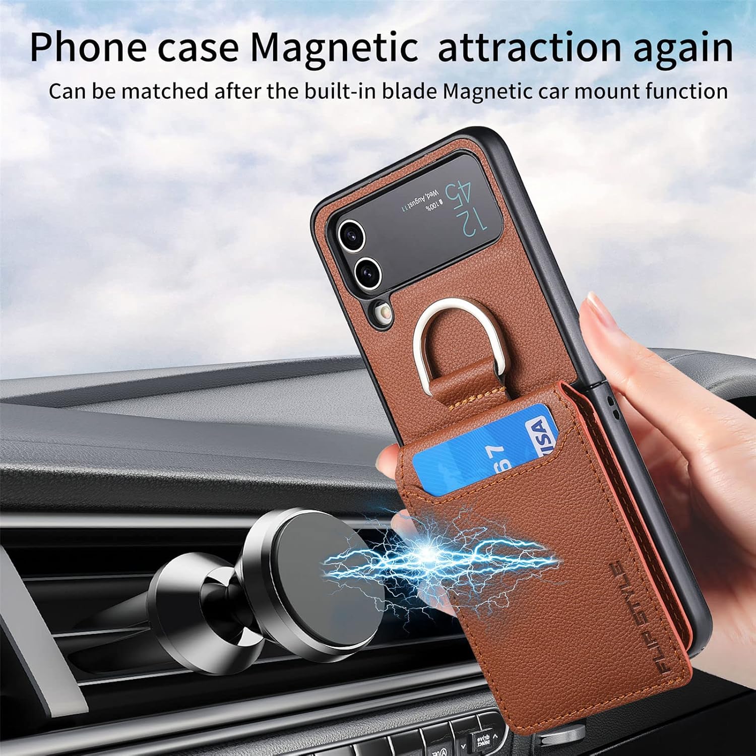 SentimentvalueTM Leather Case with Card Holder and Metal Ring for Galaxy Z Flip 3/Galaxy Z Flip 4/Galaxy Z Flip 5/Galaxy Z Flip 6