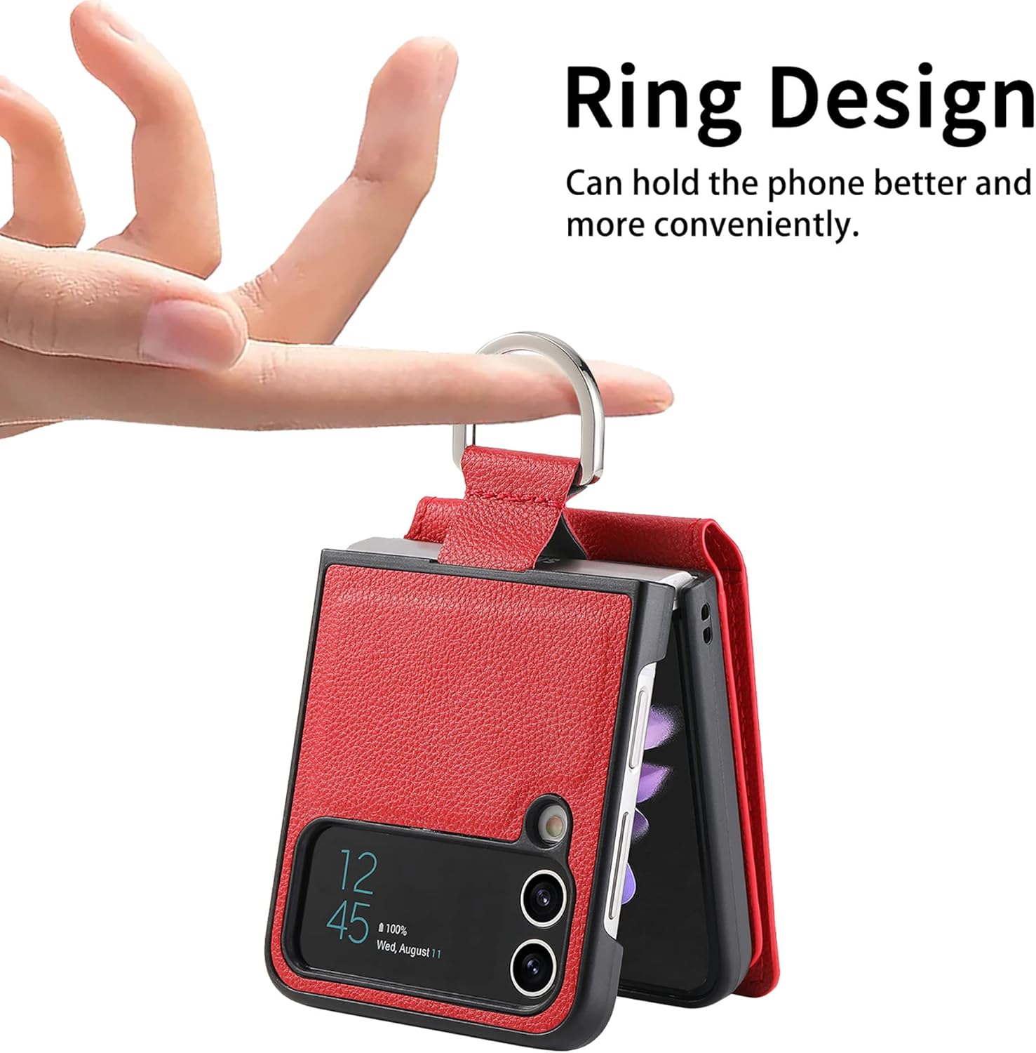 • The Ring Holder - Galaxy Z Flip 3/4/5/6 wallet case has a metal ring on the protective cover, making your phone easier to hold and more comfortable. The ring will firmly hold the phone in your hand. It can also be added to keyrings, belt buckles, or any type of lanyard and strap.