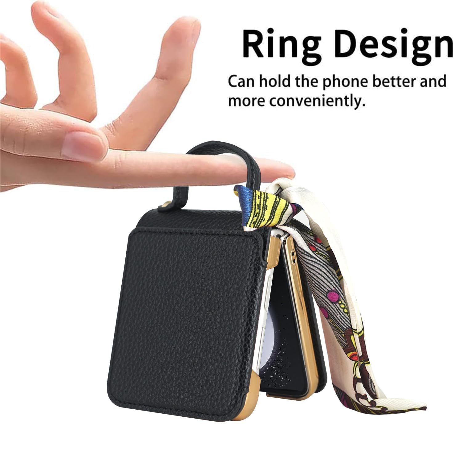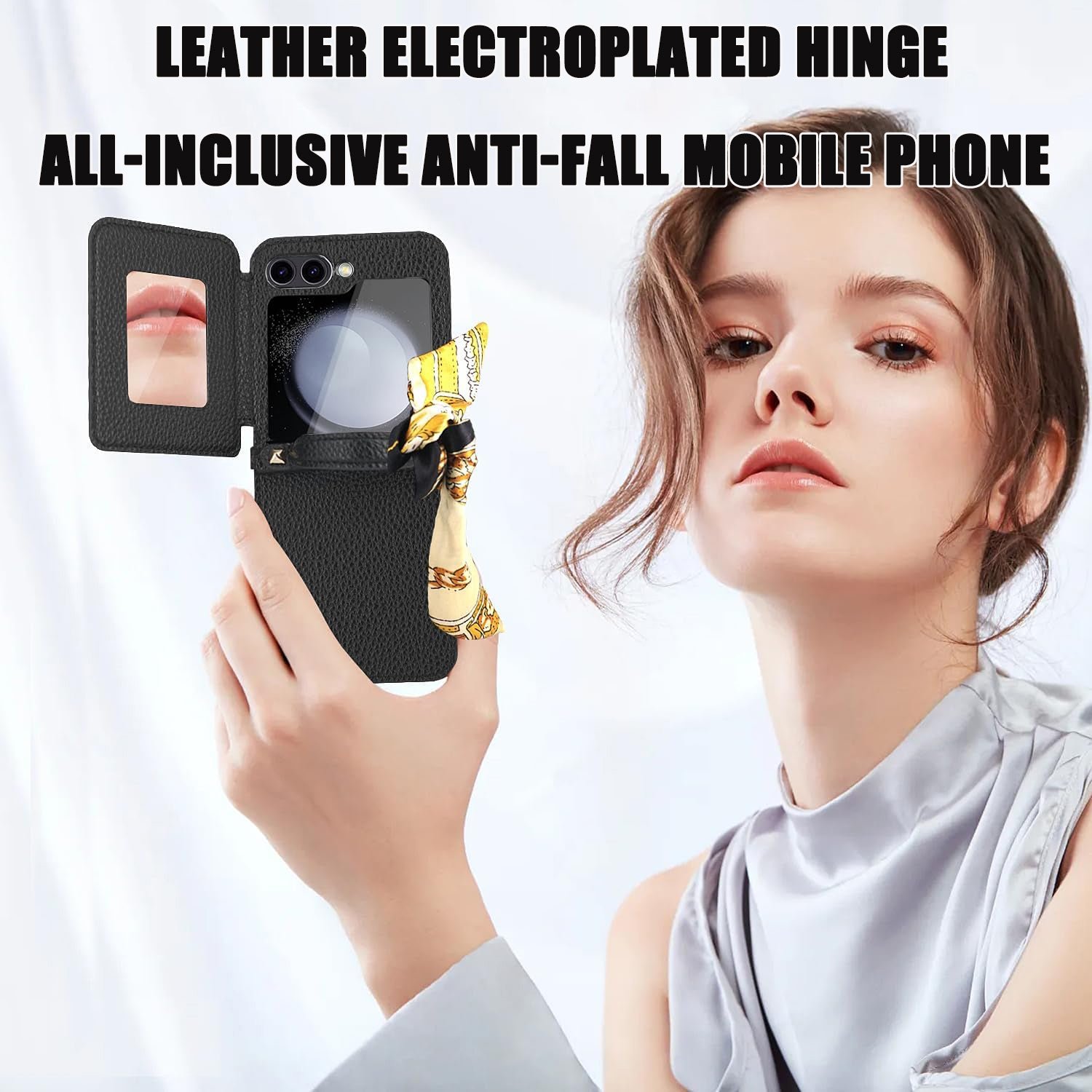 This premium leather phone case combines elegance, convenience and style. Make a statement with your Galaxy Z Flip and enjoy the added benefits of a built-in mirror and a chic scarf accessory. Order yours today and transform your phone into a fashion-forward accessory.