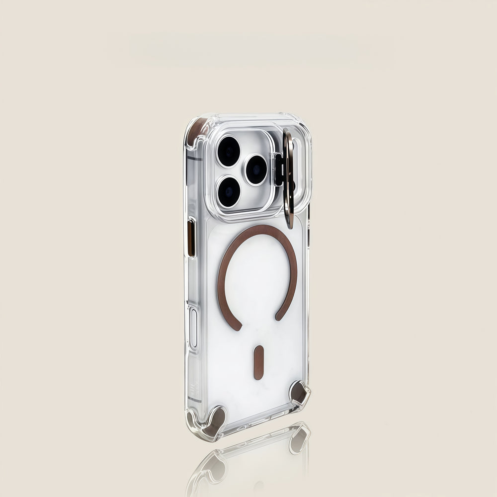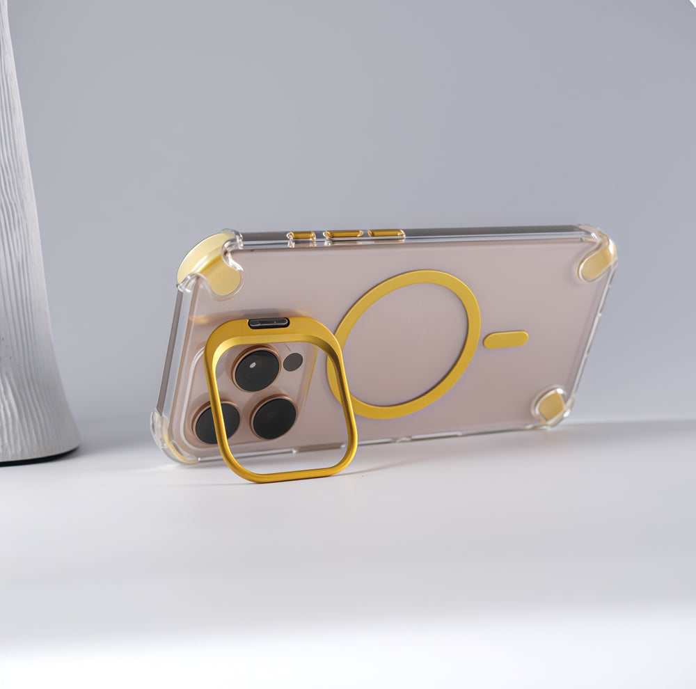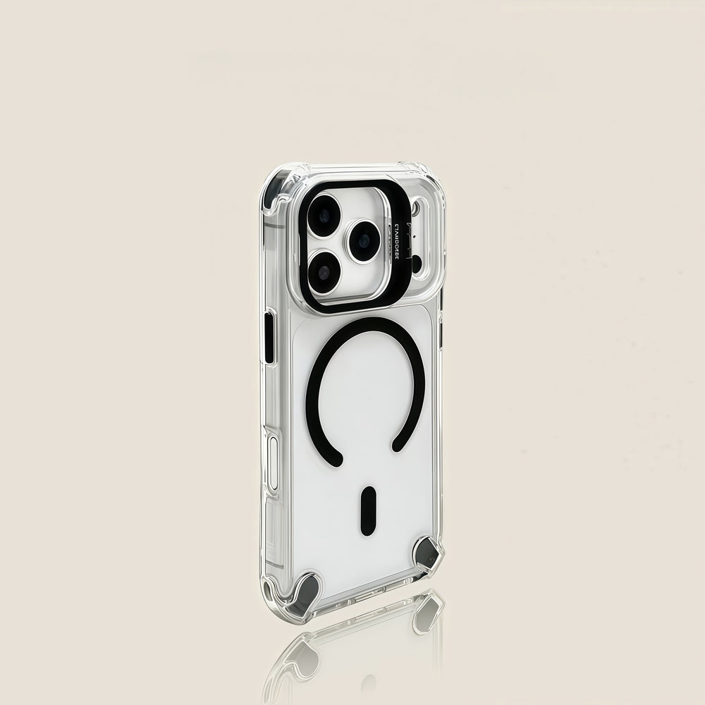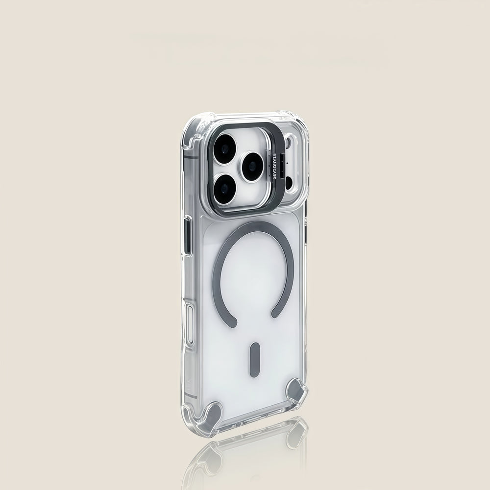 四角气囊提供全面保护,单镜头支架确保拍摄稳定,光滑高透光设计兼容触摸和磁性功能。
