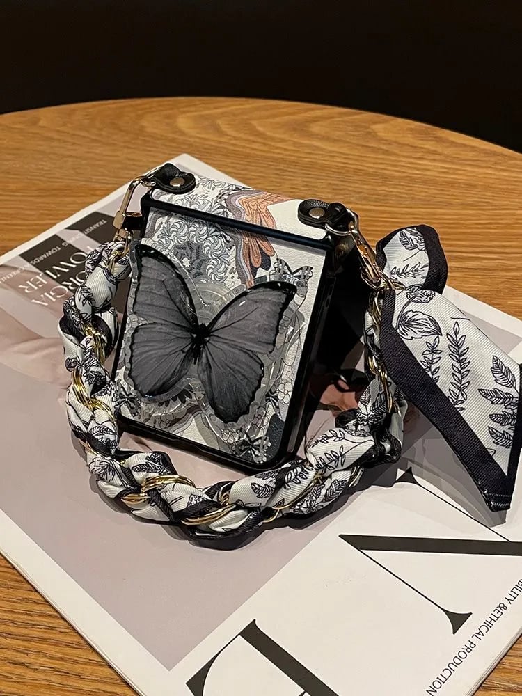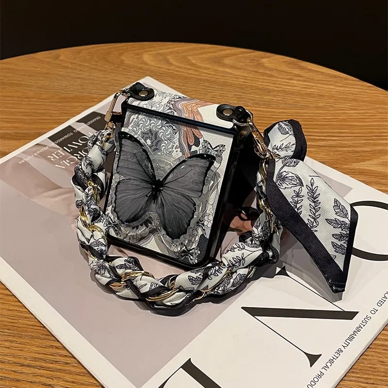 Enhancing its uniqueness, the case comes with a bohemian-style silk scarf handle, adding a fashionable and luxurious touch. The soft, patterned scarf not only elevates the look but also ensures a comfortable grip for effortless carrying.