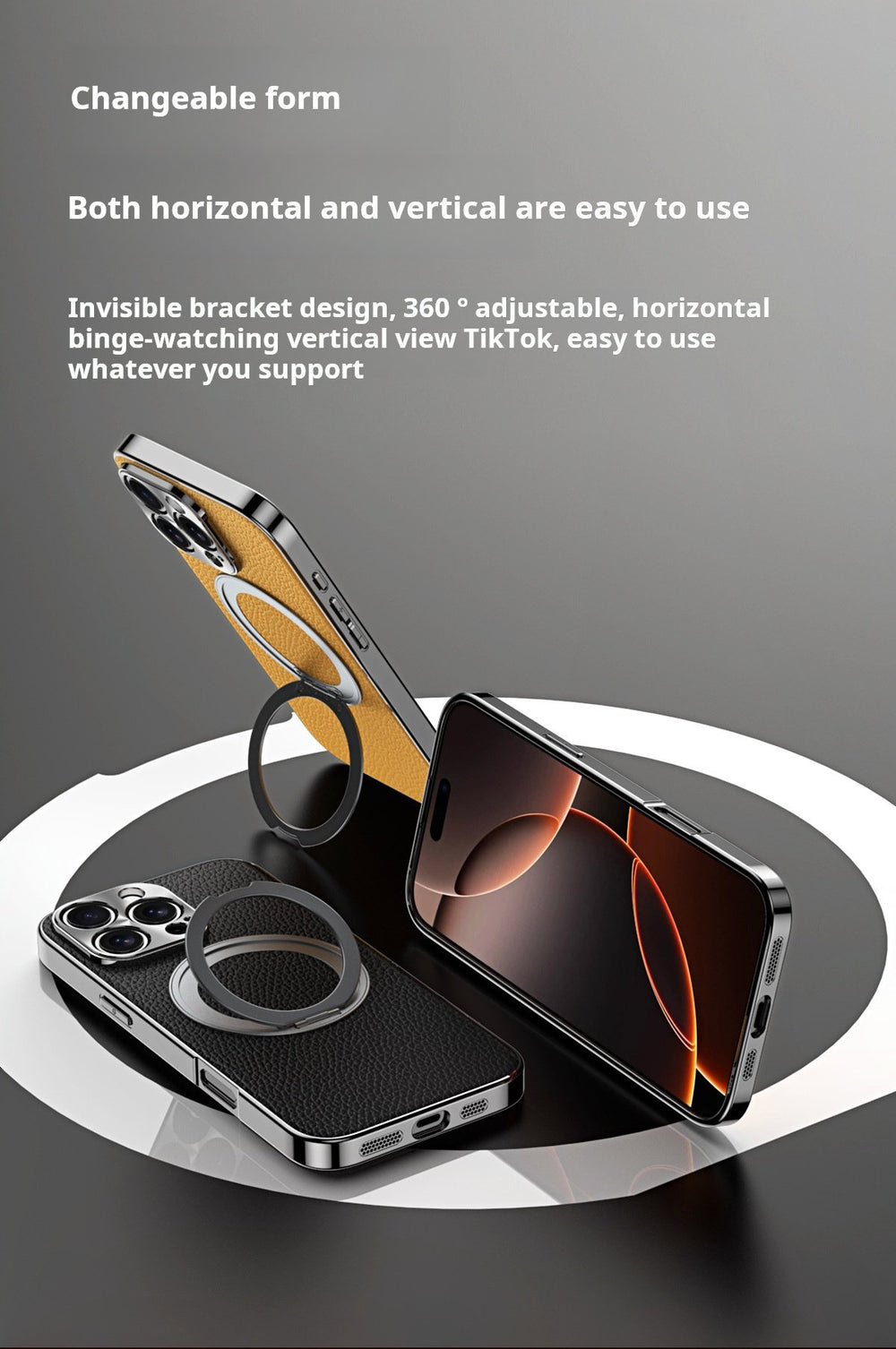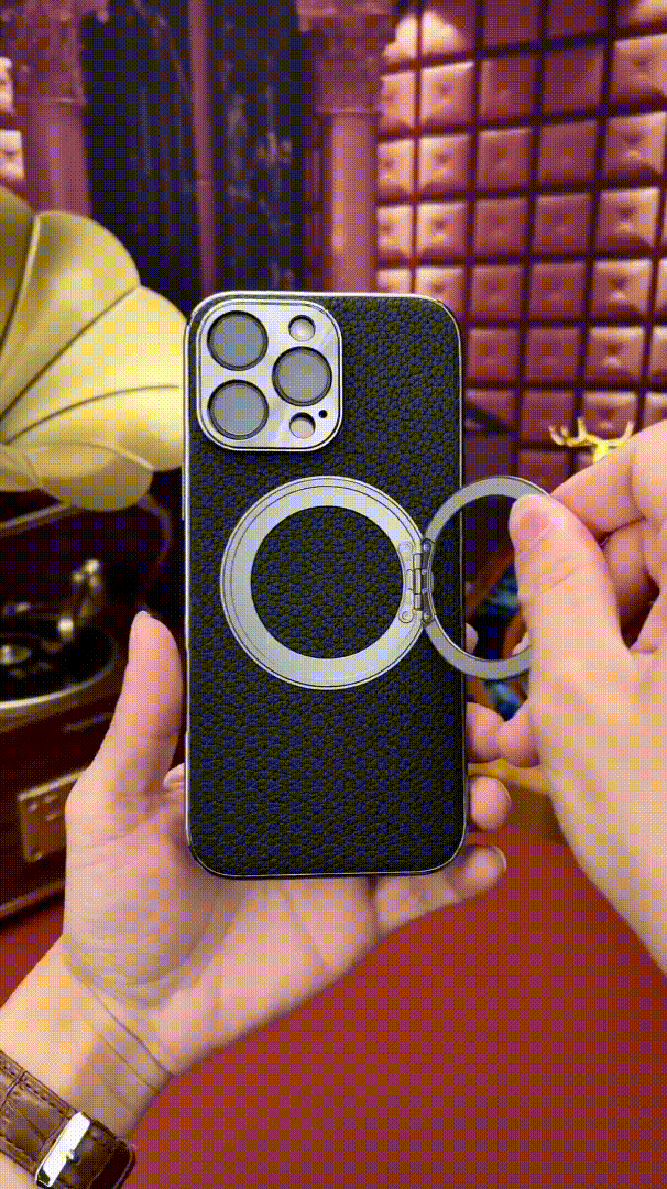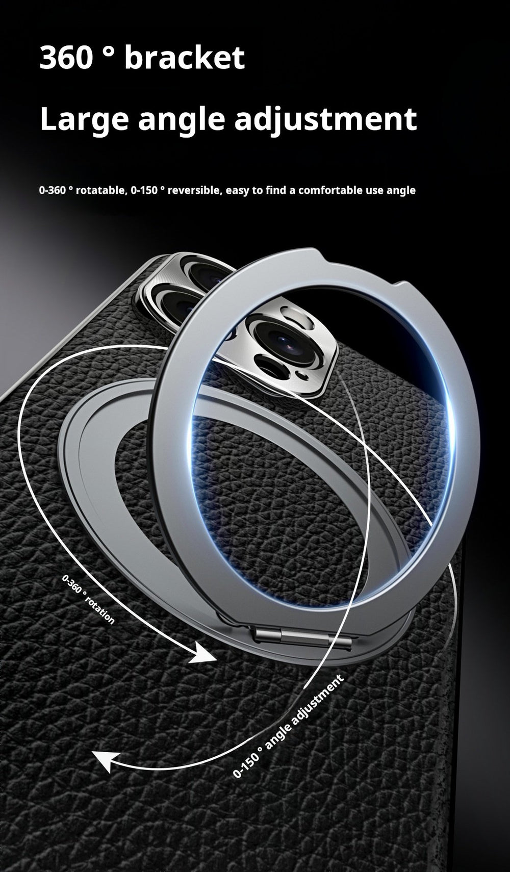 Featuring a built-in ring bracket, this case offers multiple functions. It serves as a secure grip, a convenient stand for hands-free viewing, and a metallic accent that complements the leather texture. The 360° rotation ensures optimal usability for different angles.