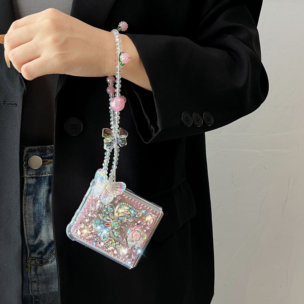 Experience the beauty and elegance of our phone case, featuring intricate floral and butterfly patterns encrusted with dazzling rhinestones. This eye-catching design not only enhances the appearance of your Galaxy Z Flip but also adds a touch of glamour to your everyday style.