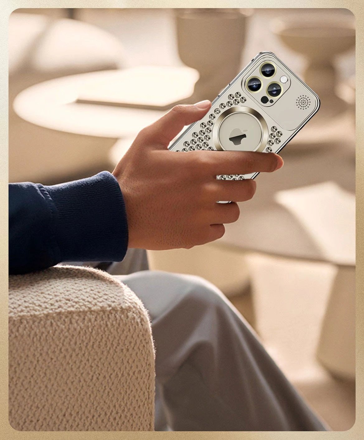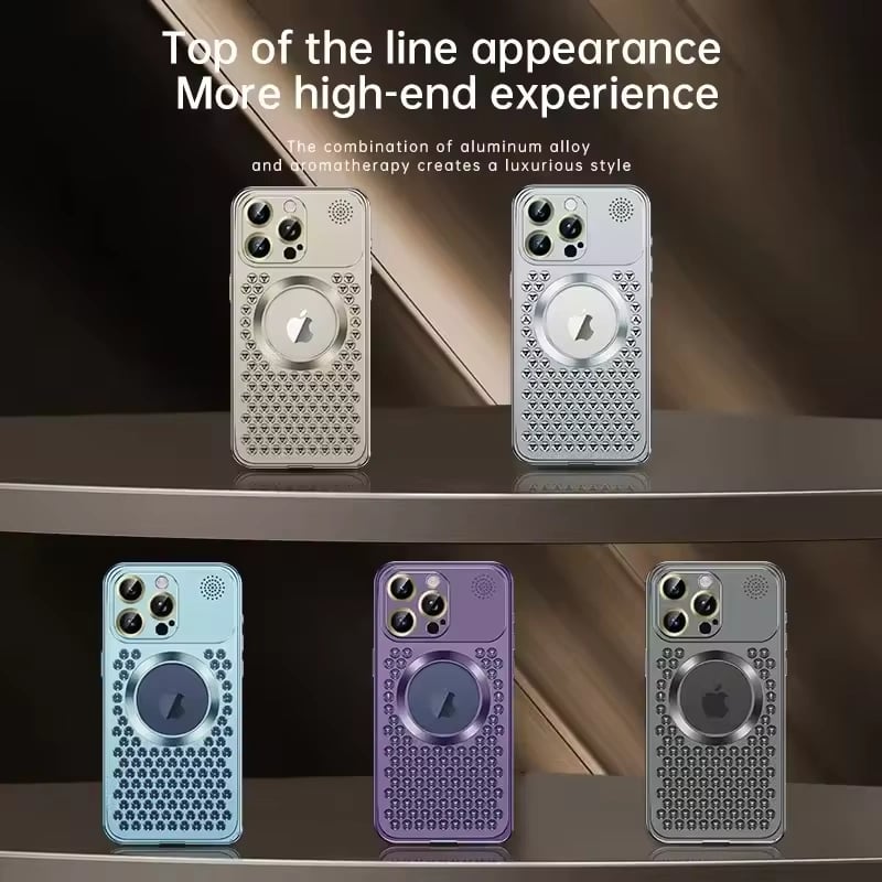 This phone case combines aesthetic elegance with practical functionality. Crafted from high-quality metal, it features a hollow design for efficient heat dissipation, ensuring your device stays cool during heavy use. The sleek spring buckle adds a touch of sophistication, while the aromatherapy feature brings a subtle, refreshing scent, making it both a protective case and a delightful sensory experience.