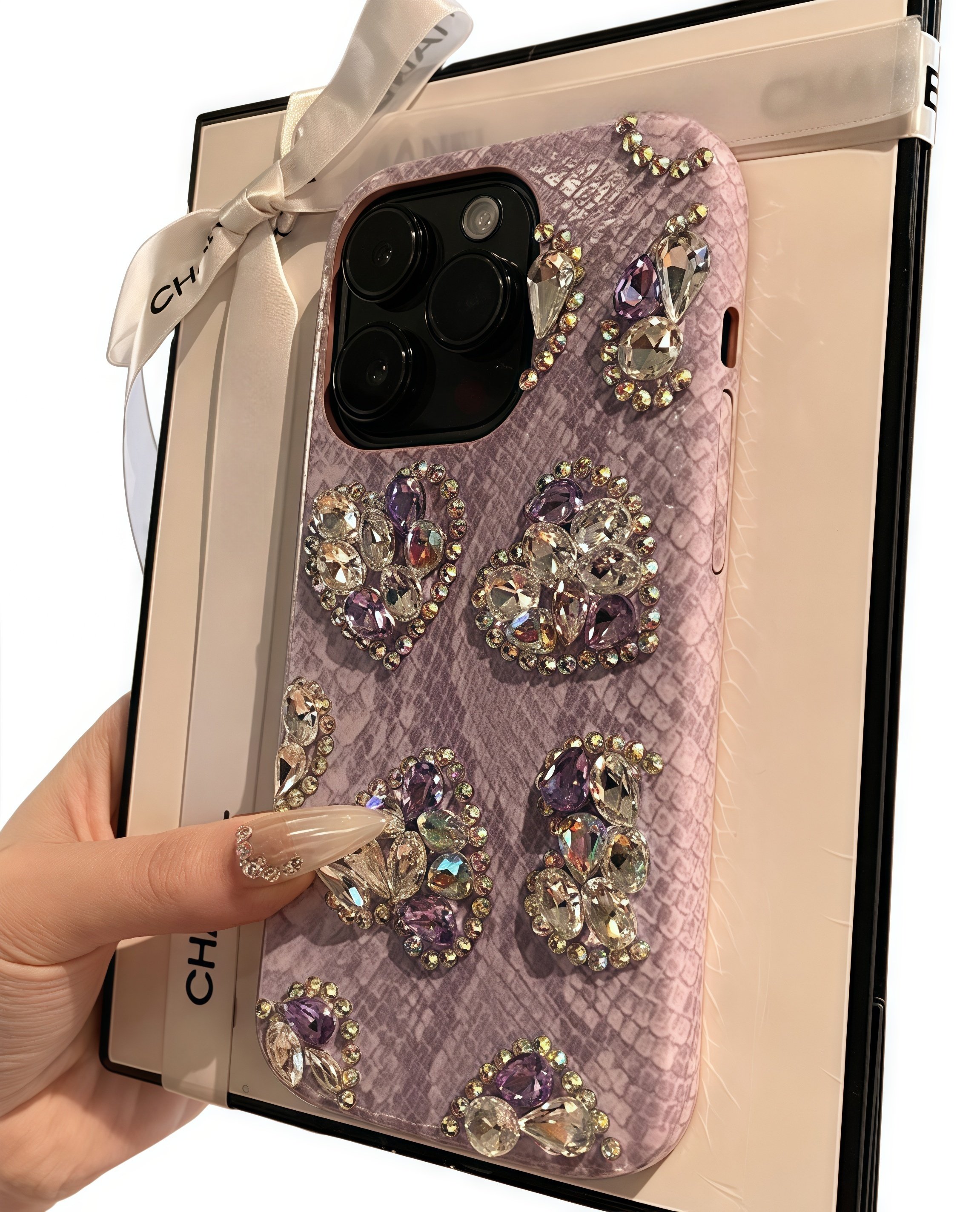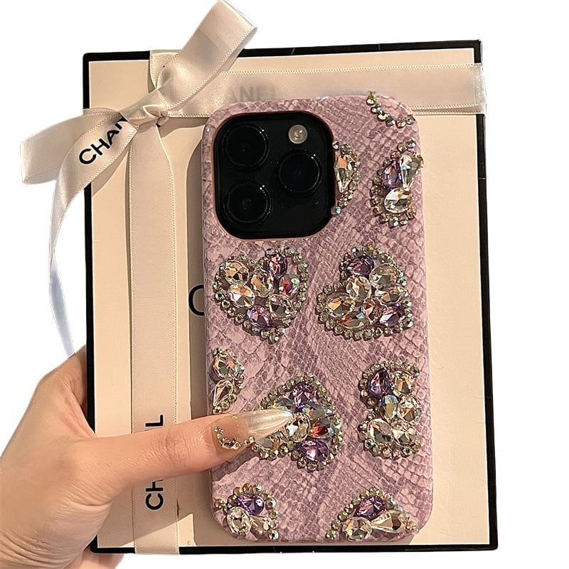 Featuring a soft purple gradient that transitions smoothly across the back, this case is decorated with carefully placed rhinestone hearts to create a luxurious, eye-catching pattern. The design reflects light beautifully, adding charm from every angle.