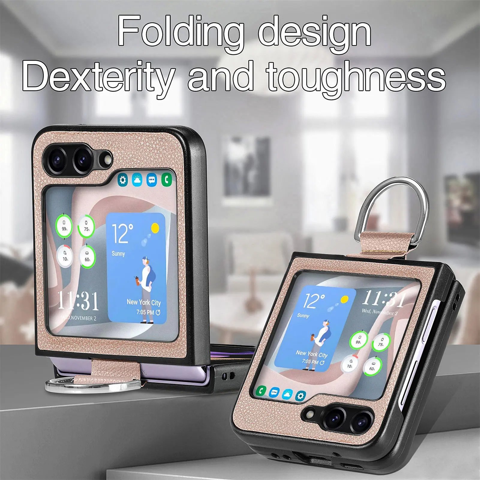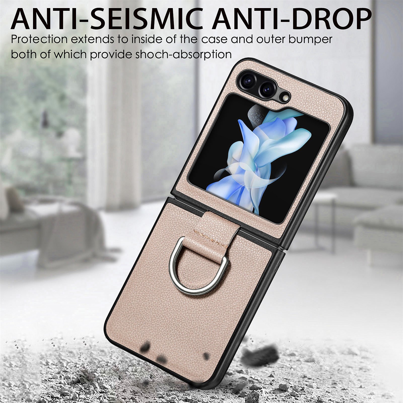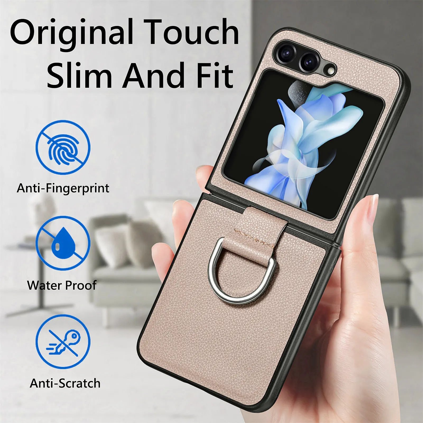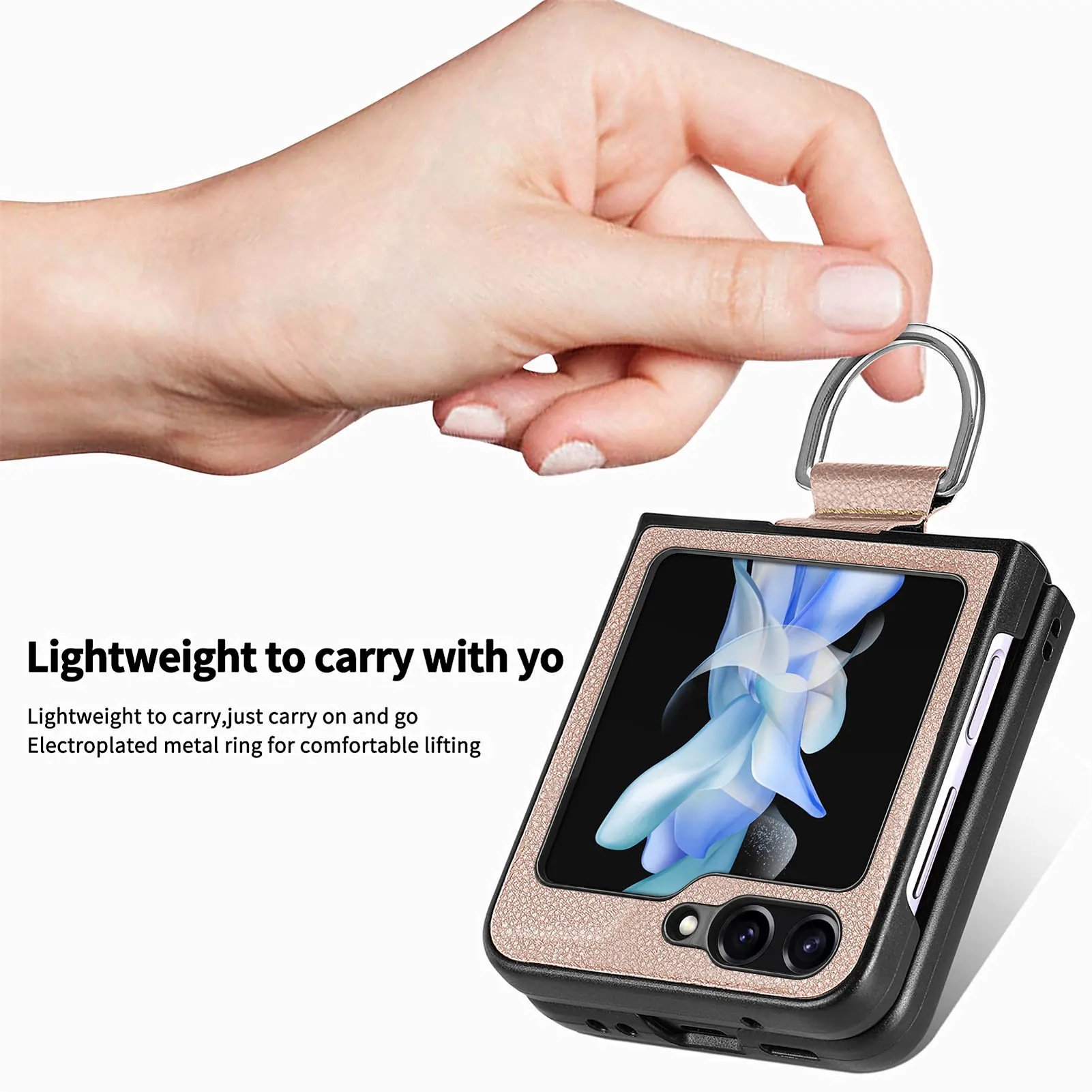 Introducing the Ring Leather Folding Screen Case, specially designed for the Galaxy Z Flip 3, Galaxy Z Flip 4, Galaxy Z Flip 5, and Galaxy Z Flip 6. This stylish case combines elegance with functionality, providing the ultimate protection for your device while enhancing its sleek design.