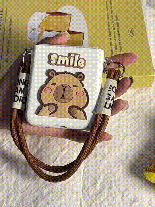 This phone case features an adorable capybara pattern embedded into the design. The capybara detailing, combined with a stylish white border, adds a fun and elegant touch to your Galaxy Z Flip 4, Z Flip 5, and Z Flip 6.