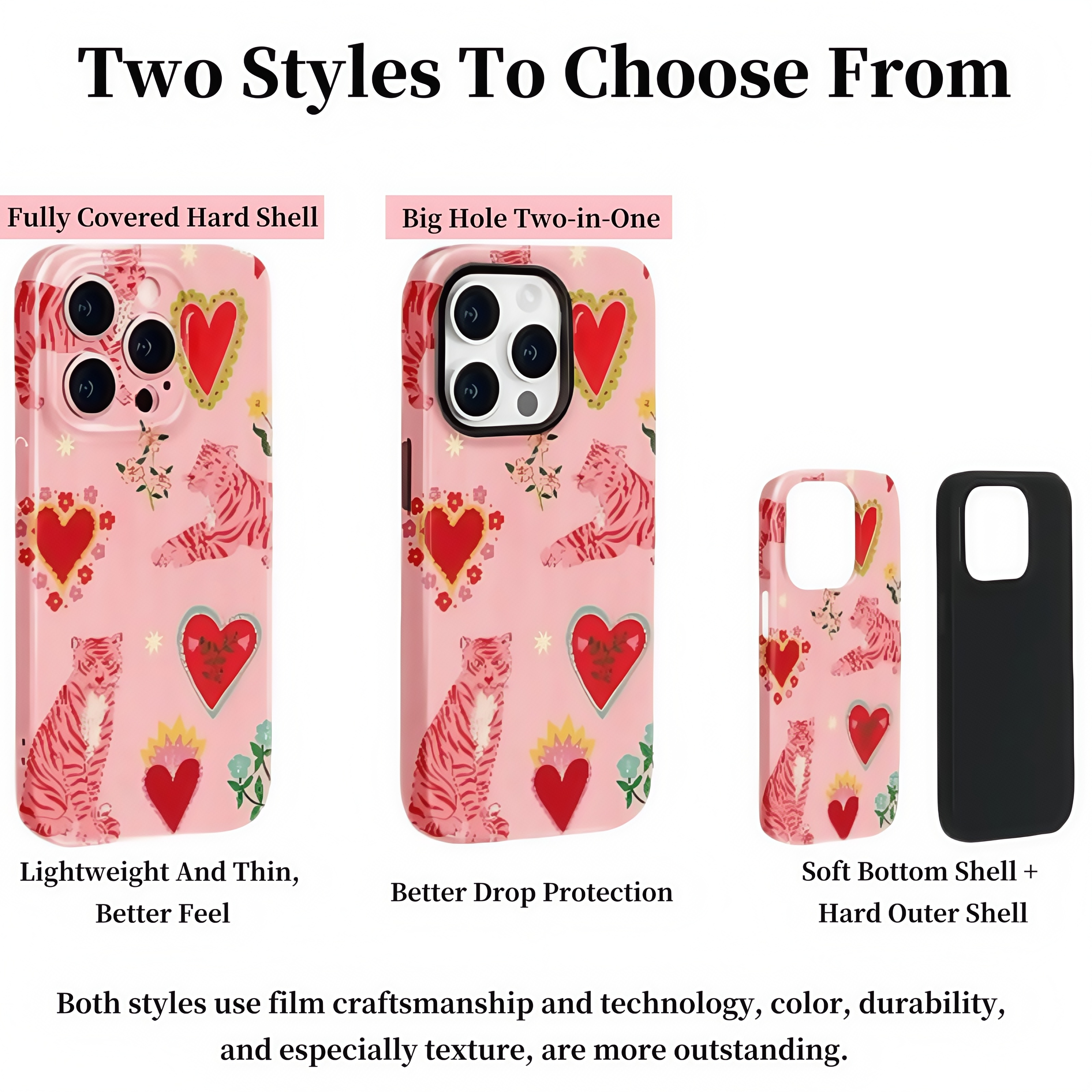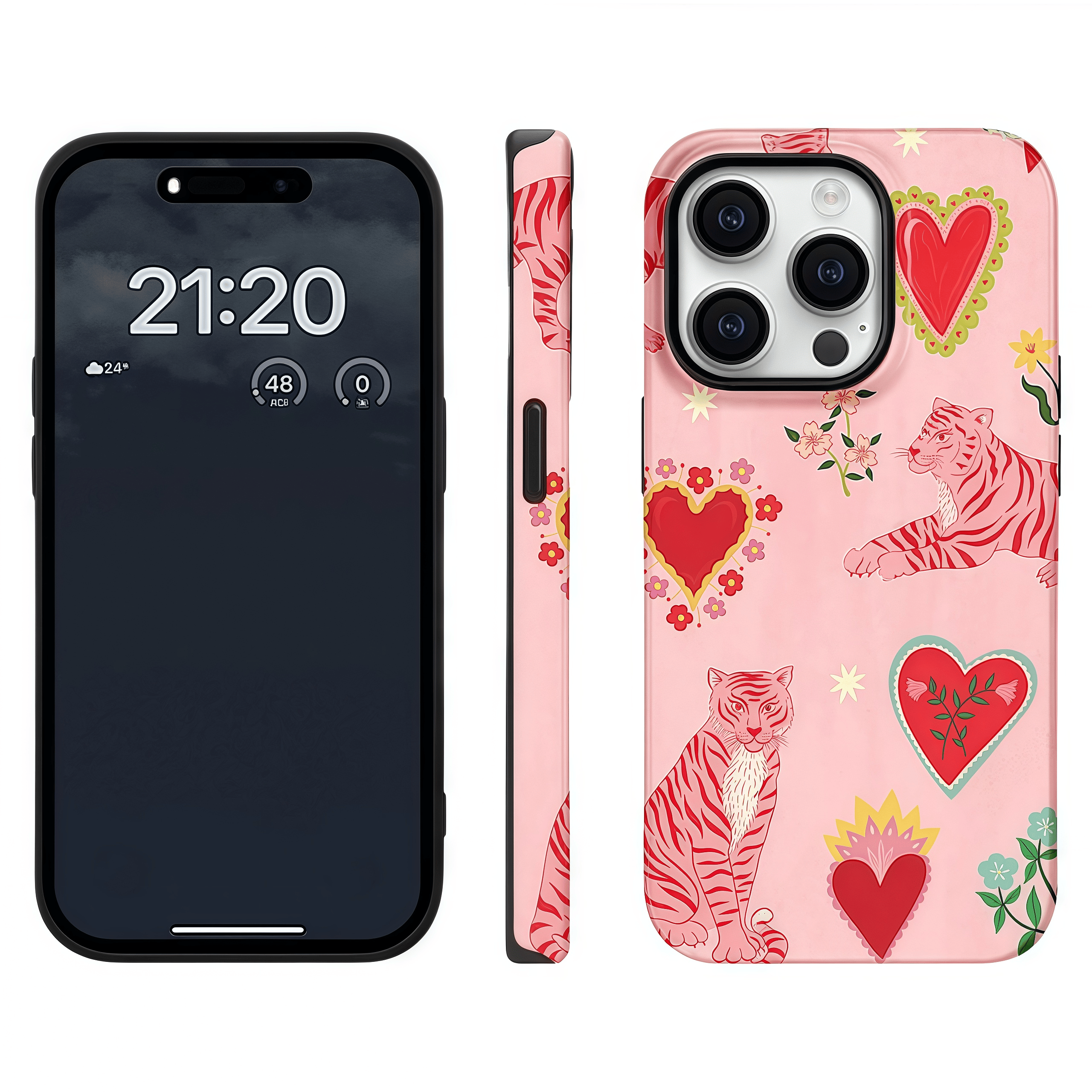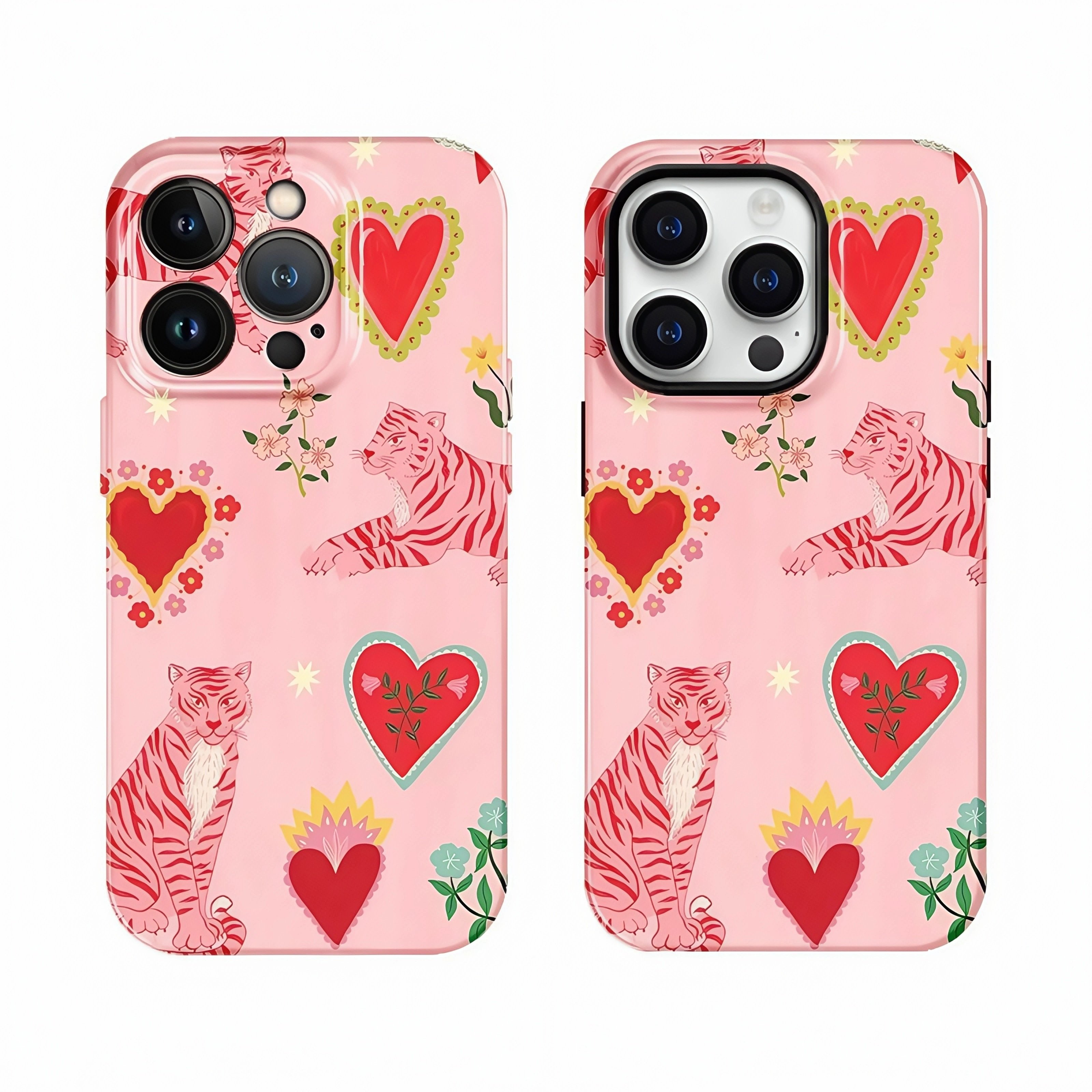 Featuring a whimsical illustration of red-striped tigers and hearts on a soft pink background, the full-wrap printed surface brings charm from every angle. The texture is smooth yet durable, making the case both beautiful and practical for everyday use.